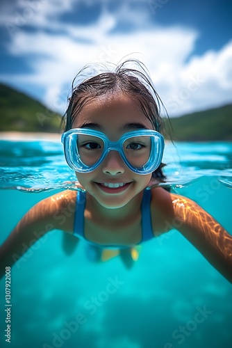 © The Little Hut, Naklejka premium Joyful girl enjoying swimming underwater with goggles in clear blue tropical ocean : Generative AI