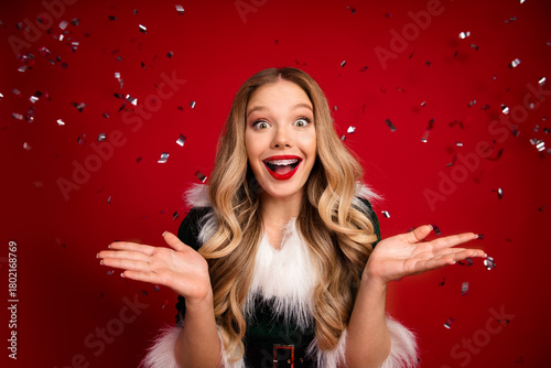 © deagreez, Naklejka premium Joyful girl in festive fur trimmed dress celebrates winter holiday with confetti against a red backdrop