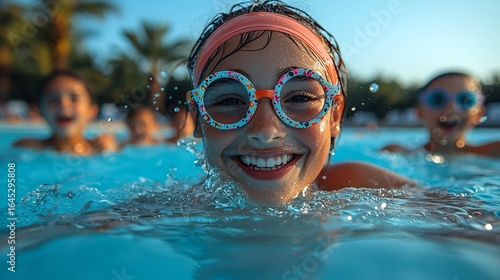 Fototapeta premium Joyful Girl in Pool Water Wearing Colorful Swim Goggles and Smiling