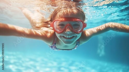© Thanthara, Naklejka premium joyful girl kid learning to swim and dive underwater in pool. active lifestyle and swimming lessons for child on summer vacation