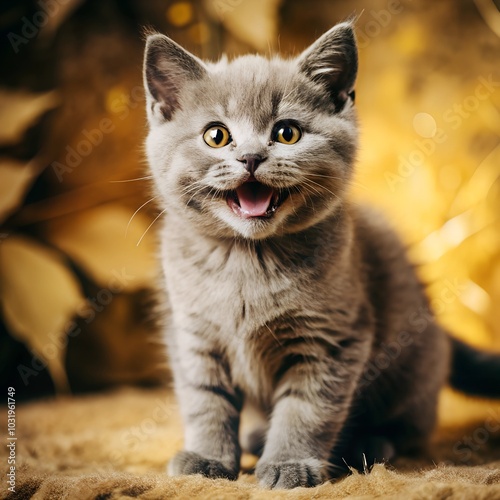 © Yauhen, Obraz premium Joyful gray british shorthair kitten on vibrant yellow background