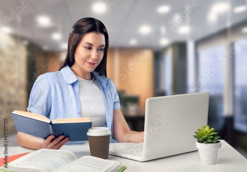 Fototapeta premium Joyful happy freelance worker works at laptop in office