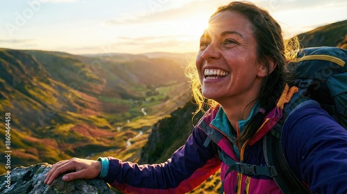 Naklejka premium Joyful hiker smiling at sunset over scenic mountain valley with colorful...