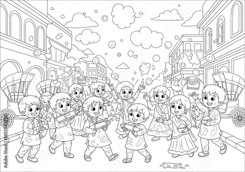 Fototapeta premium Joyful Holi Celebration: Children Playing with Water Guns in a Festive Street Scene, Line Art Illustration