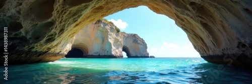Fototapeta premium Joyful journey, exploring hidden coastal caves, bright blue sky , shadow,...