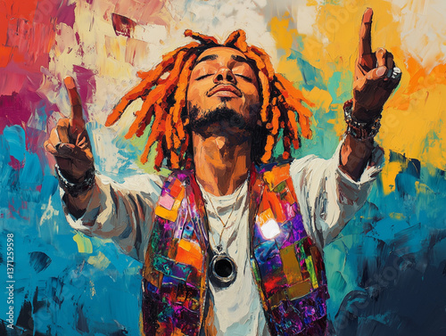 © Robert, Fototapeta premium Joyful Man with Dreadlocks Urban Style Celebrating with Raised Hands