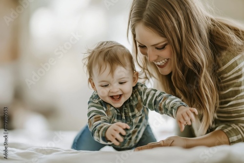 Obraz premium Joyful moments of a young mother playing with her baby on a white bed in a...