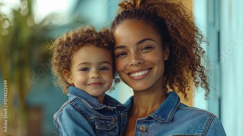 © Borasca, Fototapeta premium Joyful mother and daughter smiling together in denim jackets outdoors