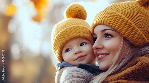 Fototapeta premium Joyful Mother Embracing Baby Autumn Smiles Sunshine Warmth Happiness Connection