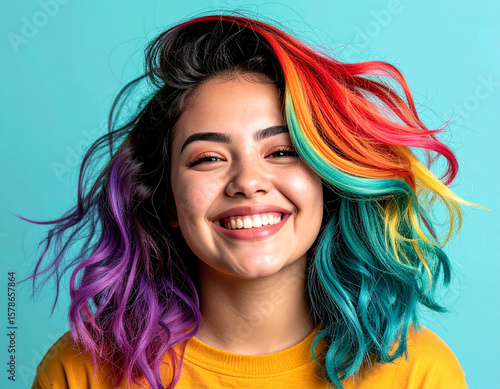 © BNMK0819, Fototapeta premium Joyful movement portrait of a happy woman with colorful hair studio fashion photography vibrant environment close-up view