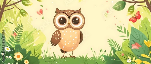 Obraz premium Joyful Owl in Whimsical Garden Frame with Blank Space for Greeting Card or...