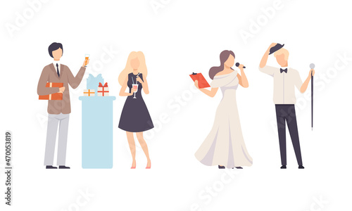 Naklejka premium Joyful People Character Drinking Cocktail and Performing Celebrating Feast Vector Illustration Set