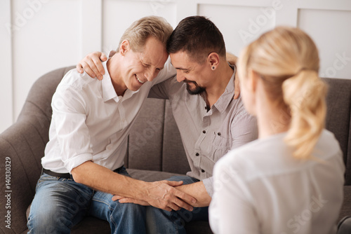 © Viacheslav Yakobchuk, Fototapeta premium Joyful pleasant gay couple enjoying time with each other