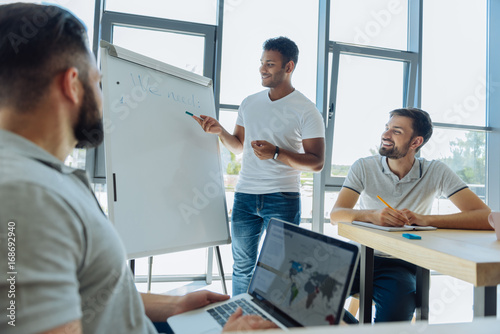 Obraz premium Joyful pleasant men listening to their training officer
