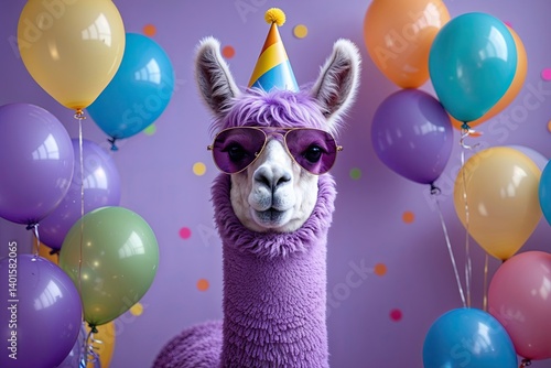 © Michael, Fototapeta premium Joyful Purple Llama Alpaca Wearing Party Hat and Aviator Sunglasses Surrounded by Colorful Balloons on Lavender Background