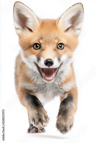 © siriwan, Fototapeta premium Joyful Red Fox Cub Running Playfully with Open Mouth and Energetic Expression