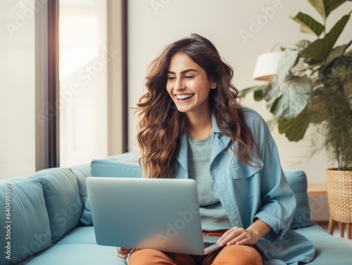 © FreyrStock, Fototapeta premium joyful relaxed smiling young woman using laptop