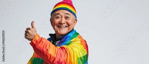 © indyntk, Fototapeta premium Joyful senior Asian citizen in rainbow LGBTQ+ apparel giving a thumbs up on a pure white background, exemplifying positivity and pride with a dynamic and colorful outfit