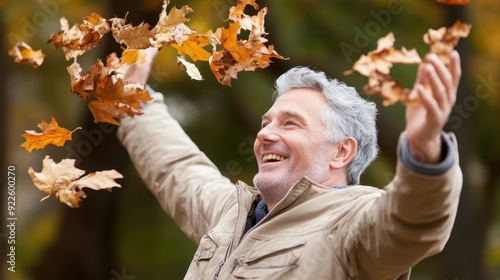 © Oksana Smyshliaeva, Obraz premium Joyful Senior Man Embracing Autumn with Open Arms and Falling Leaves