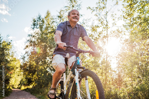 © Viktor Koldunov, Fototapeta premium Joyful senior man riding a bike in a park on a beautiful sunny day