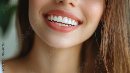 Obraz premium Joyful smile of a young woman indoor setting portrait photography bright environment close-up view dental health concept