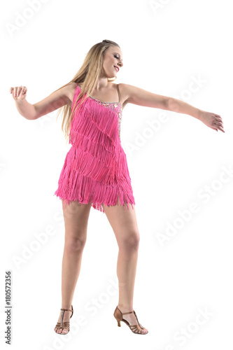Fototapeta premium Joyful smiling caucasian woman dancing Latino dances in pink fringe dress. Full body length portrait isolated on white studio background.