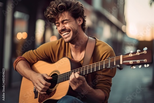 Fototapeta premium Joyful Street Musician Strumming Acoustic Guitar in Vibrant Urban Setting....
