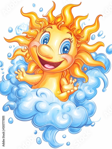 © Nur, Fototapeta premium Joyful Sun Character in Clouds; Cartoon Illustration for Children's Book or Website