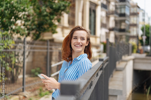 Obraz premium Joyful vivacious young woman on an urban walkway