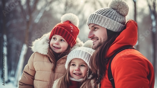 © Suralai, Fototapeta premium Joyful winter family moments: parents and daughters share smiles outdoors, generative ai