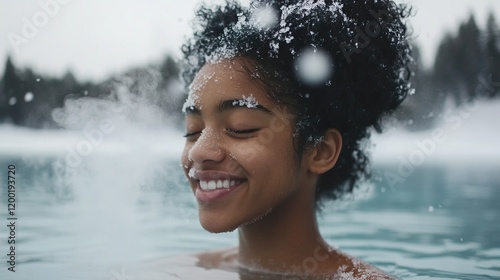 Fototapeta premium Joyful winter swimming bliss captured in frosty snowy landscape scene. Cold...