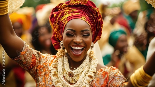 © Ariestia, Fototapeta premium Joyful woman celebrating in traditional colorful wedding attire with jewelry