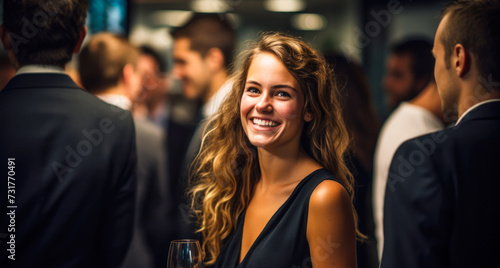 © Bartek, Fototapeta premium Joyful woman enjoying a lively conversation at a sophisticated evening networking event with professionals engaging in background discussions
