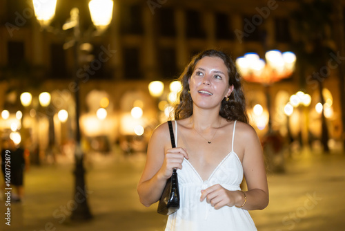 Fototapeta premium Joyful woman in a white dress walks around a European city in the summer, she plans to go to a party in a nightclub and a bar. Barcelona nightlife