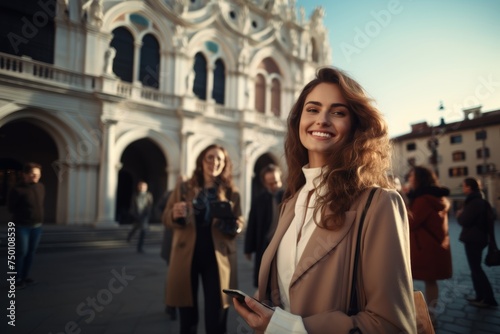 Fototapeta premium Joyful woman using smartphone, historical architecture, busy street, tourism, vibrant city life, elegant style, sunny