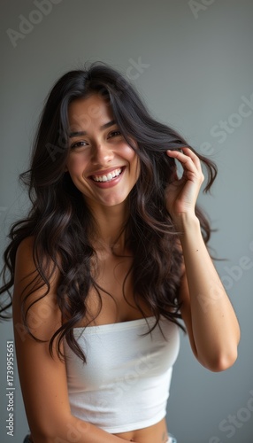 Obraz premium Joyful woman with long, wavy hair smiling brightly