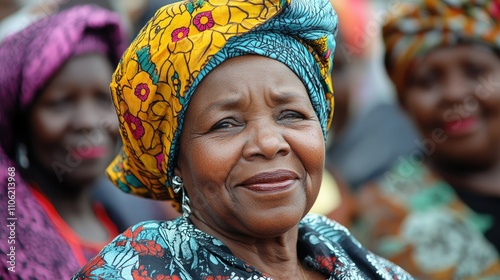 Fototapeta premium Joyful women wearing colorful headwraps smiling together in a vibrant setting