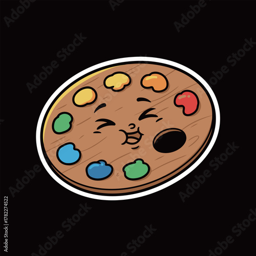 © Zhangxiao, Fototapeta premium Joyful Wooden Artist's Palette with Colorful Paint Spots Cartoon Character Sticker: Happy Painter Mascot for Art and Creativity