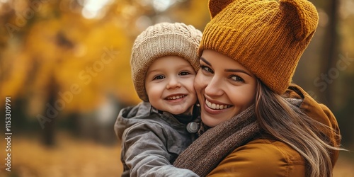 © Rasim, Fototapeta premium Joyful young family enjoying a beautiful autumn nature stroll. The mother, in an ear flapped hat, engages with her son in a doctor game. The little boy smiles, embodying the family concept.