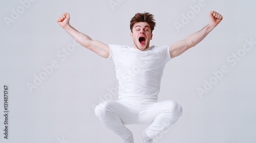© Raul, Fototapeta premium Joyful young man in white sportswear jumps and shouts with arms raised against a light gray background.