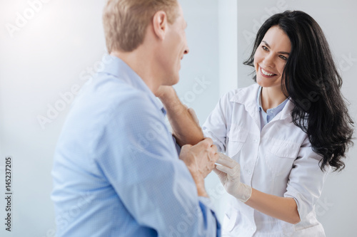 Fototapeta premium Joyful young practitioner treating mature patient in the hospital