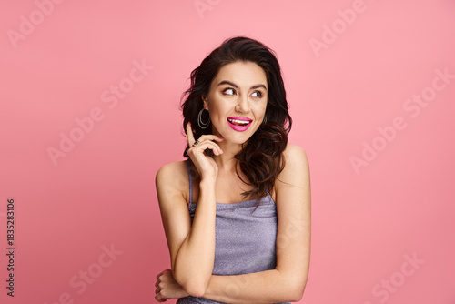 Fototapeta premium Joyful young woman expressing her playful spirit against a vibrant pink backdrop