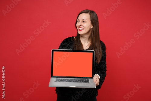 © ViDi Studio, Naklejka premium Joyful young woman in black fur sweater looking aside hold laptop pc computer with blank empty screen isolated on bright red background. People sincere emotions, lifestyle concept. Mock up copy space.