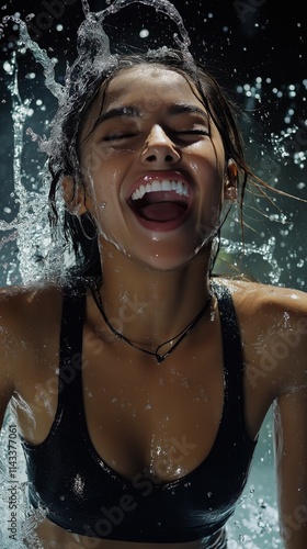 © GeorgV, Obraz premium Joyful Young Woman Splashing Water in Pool