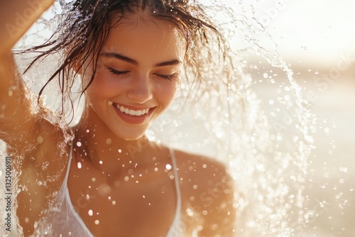 Fototapeta premium Joyful young woman splashing water while enjoying a sunny beach day in a...