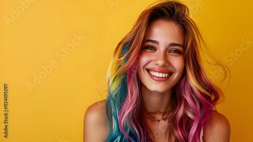 © Kanika Graphic, Fototapeta premium Joyful young woman with colorful hair smiling against a vibrant yellow background