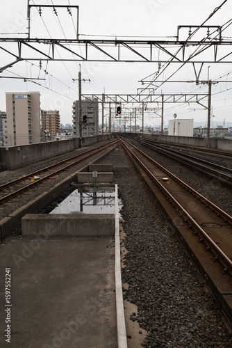 © Bhdr1996, Fototapeta premium 日本、大阪府、住道駅、大東市、西日本旅客鉄道、JR西日本、城市、交通、橋、ビル、曇天、風景、堀、川、雲、写真素材