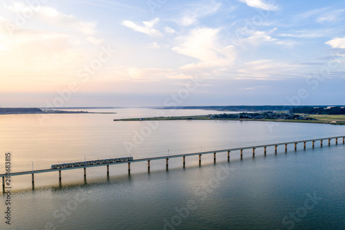 © Kumi, Fototapeta premium 夏の夕暮れ時の北浦とJR鹿島線を俯瞰撮影