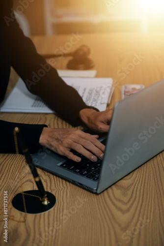 © Kansuda, Fototapeta premium Judge gavel with Justice lawyers having team meeting at law firm background. Concepts of Law and Legal services.