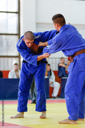 © marritch, Obraz premium Judoka in blue judogi holding his dominant guard